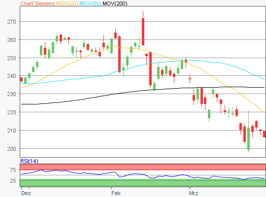 Zuletzt handelte die Siemens Aktie im Bereich rund um die 204 Euro Marke.