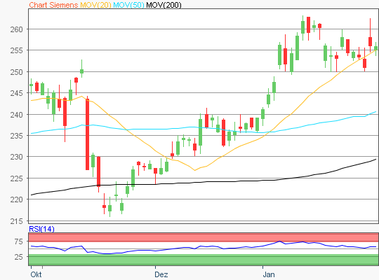 Zuletzt handelte die Siemens Aktie im Bereich rund um die 256,30 Euro Marke.