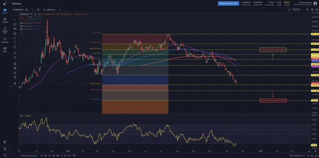 Die Chartanalyse erfolgt im vorliegenden Fall im Tageschartbild. Als Referenzwert gilt der jeweilige Kurs des CFDs auf die Aktie von Strategy (Symbol: MSTR), die mit hohem Volumen an der Technologiebörse NASDAQ gehandelt wird. Mit hohem Volumen ist gemeint: Am 19. November 2025 waren es rund 5,2 Milliarden US-Dollar – die 40 DAX-Werte haben das am Mittwoch nicht geschafft.