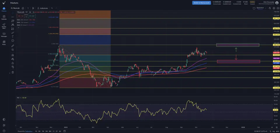 Die Chartanalyse erfolgt im vorliegenden Fall im Tageschartbild. Als Referenzwert gilt der jeweilige Kurs des CFDs auf die Aktie von Tesla, die an der „NASDAQ“ (Symbol: TSLA) mit hohem Volumen gehandelt wird. Ausgehend von der Analyse vom hier relevanten Hoch des 18. Dezember 2024 von 488,360 US-Dollar bis zum Verlaufstief des 07. April 2025 von 214,250 US-Dollar, wären die nächsten Ziele zur Ober- und Unterseite möglicherweise näher zu ermitteln. An diesen beiden Startmarken könnte eine Fibonacci-Analyse angelegt werden. Die dann von der Handelsplattform „ActivTrader“ ausgeworfenen Fibonacci-Retracements und Fibonacci-Projektionen könnten dann zur Ableitung der künftigen Widerstände und Unterstützungen herangezogen werden. Auf der Oberseite wären die Widerstände bei der Marke von 488,360 US-Dollar (1.00%), sowie bei den Projektionen zur Oberseite von 553,050 US-Dollar (1.236%), 593,070 US-Dollar (1.382%) und 657,760 US-Dollar (1.618%) abzuleiten. Zur Unterseite könnten die Marken von 423,670 US-Dollar (0.764%), 383,650 US-Dollar (0.618%), 351,305 US-Dollar (0.50%), 318,960 (0.382%), 278,940 US-Dollar (0.236%) und 214,250 US-Dollar (0.00%) als künftige Unterstützungen herangezogen werden.