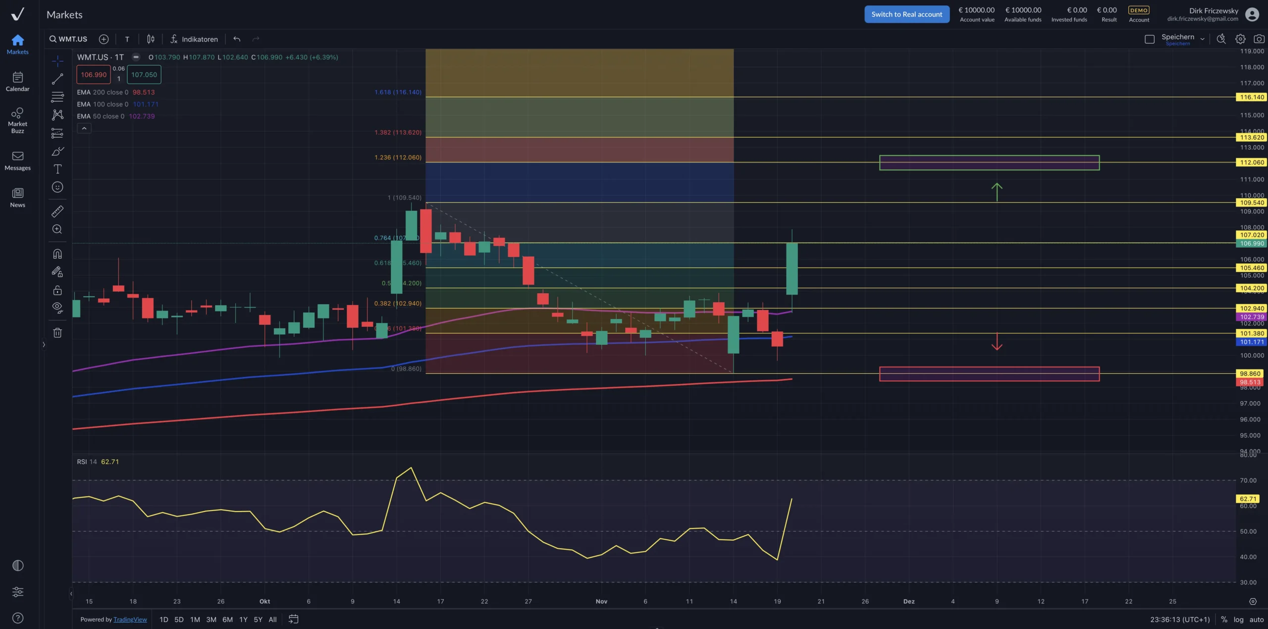 Die Chartanalyse erfolgt im vorliegenden Fall im Tageschartbild. Als Referenzwert gilt der jeweilige Kurs des CFDs auf die Aktie von Walmart (WMT) via NYSE. Der Kursverlauf vom letzten hier für die Analyse relevanten Zwischenhoch des 16. Oktober 2025 von 109,540 US-Dollar bis zum Zwischentief des 14. November 2024 bei 98,860 US-Dollar, könnte zur Ermittlung der nächsten Ziele zur Ober- und Unterseite genutzt werden. An diesen beiden Startmarken könnte eine Fibonacci-Analyse angelegt werden. Die dann von der webbasierten Handelsplattform „ActivTrader“ ausgeworfenen Fibonacci-Retracements und Fibonacci-Projektionen könnten der Ermittlung der künftigen Widerstände und Unterstützungen dienen.