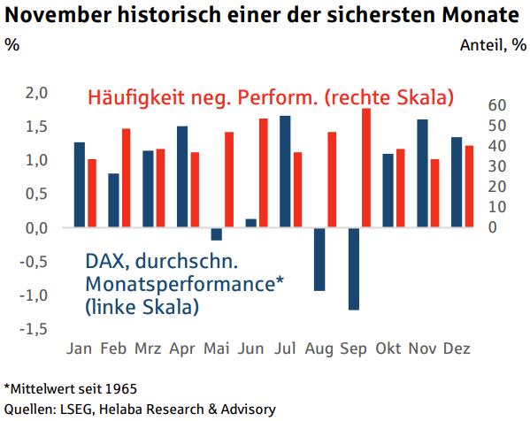 Zahlreiche Aktienindizes tun sich nach den bislang überdurchschnittlichen Kurszuwächsen inzwischen schwer, weiter zuzulegen. Rund um den Globus dominierten zuletzt die Minuszeichen. Dabei wäre saisonal betrachtet die gegenwärtige Phase sehr günstig für Aktien. Im langjährigen Durchschnitt hat sich der November sowohl am deutschen als auch am US-Aktienmarkt als der performancestärkste erwiesen. Zudem zählt er als der sicherste Monat.