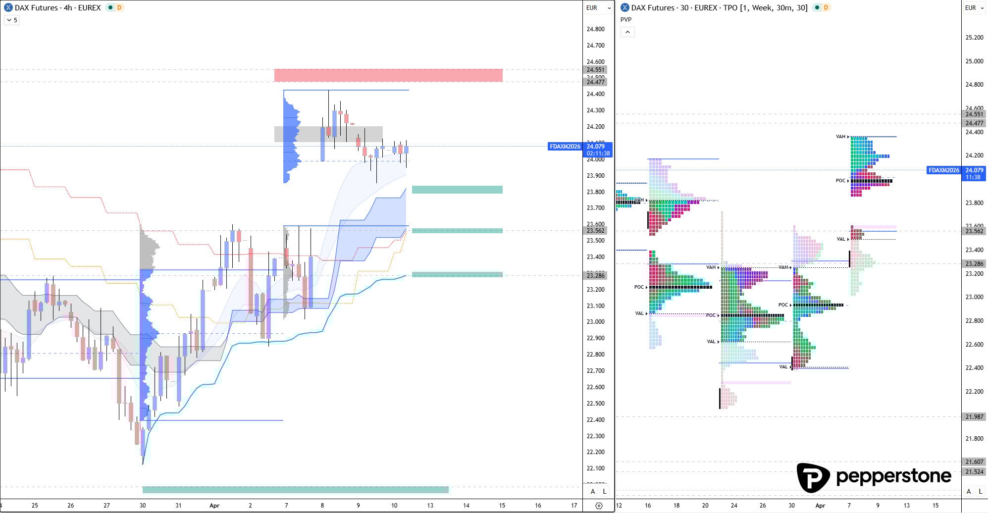 Der DAX ist am Donnerstag erneut in die Widerstandszone um 24.480 bis 24.530 Punkte angelaufen. Noch ist der Markt von dort nicht tief genug korrigiert, um daraus für mich eine saubere Handelbarkeit abzuleiten – die Verortung ist aktuell zu „mittig“, um einen Long mit gutem CRV zu rechtfertigen, und zugleich nicht überdehnt genug, um Shorts sinnvoll zu forcieren.