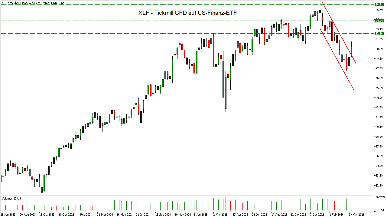 Wer im Hinblick das Trading von Quartalszahlen im Finanzsektor kein Stockpicking betreiben möchte, kann sich hier auch mit dem XLF – ETF auf den US-Finanzsektor – positionieren. Als klassischen ETF können private Trader keine Investments tätigen, doch mit dem Tickmill CFD auf diesen ETF bietet sich eine einfache Möglichkeit an, diesen Sektor-Earnings-Trade umzusetzen.