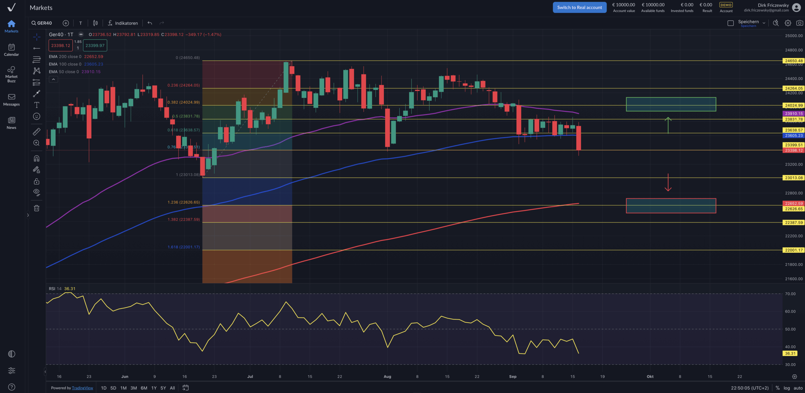 Eine Fibonacci-Analyse wäre am Zwischentief des 19. Juni 2025 von 23.013,08 Punkten anzulegen und bis zum Rekordhoch des 10. Juli 2025 von 24.650,48 Punkten zu ziehen (beim Xetra-DAX lag das Hoch bei 24.639,10 Punkten), um so die nächsten möglichen Ziele zur Oberseite ausmachen zu können.