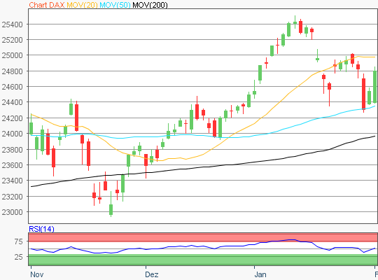 Der Xetra-DAX schloss am Montag, den 02. Februar 2026 mit einem Kursgewinn von 1,05 Prozent und 24.797,52 Punkten. Das Handelsvolumen via Xetra betrug recht hohe 3,83 Milliarden Euro.