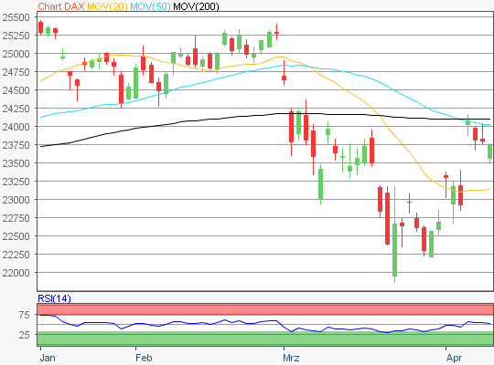 Die Der Xetra-DAX schloss am Montag, den 13. April 2026 mit einem Minus von 0,26 Prozent und 23.742,44 Punkten.
