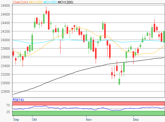 Der Xetra-DAX schloss am Donnerstag, den 18. Dezember 2025 mit einem Zugewinn von 1,00 Prozent und 24.199,50 Punkten. Das Handelsvolumen via Xetra betrug rund 3,49 Milliarden Euro.