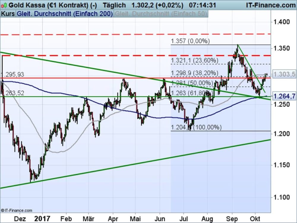 Der Goldpreis hatte Anfang Oktober eine technische Gegenoffensive gestartet. Diese könnte durchaus noch eine Weile andauern. Voraussetzung dafür wäre jedoch ein beherzter Sprung über die einfache 50-Tage-Durchschnittslinie bei aktuell 1.303 USD (Goldpreis Rechner