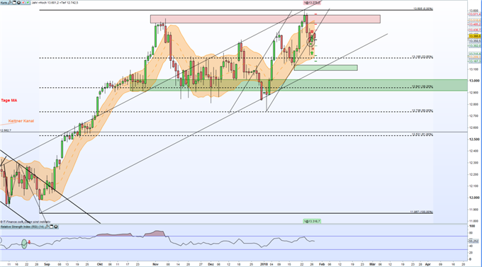 Sollten die Bären hier jedoch den Bullen ein Strich durch die Rechnung machen und sogar den Tagespivotpunkt bei 13.350 Punkten übernehmen, so sollten Anleger das Vorwochentief bei 13.215 Zählern im Auge behalten. Ein Fall auf Schlusskursbasis unterhalb dieser Marke, könnte eine neue Abwärtsrallye lostreten.