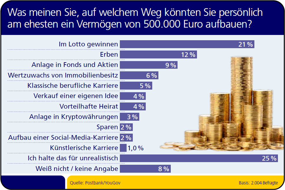 Ein Vermögen von 500.000 Euro – für viele ein erstrebenswertes, nicht unrealistisches Ziel. Zwei von drei Deutschen können sich laut aktueller Postbank Umfrage vorstellen, diese Summe im Laufe ihres Lebens aufzubauen. Doch wenn es um den Weg dorthin geht, verlässt sich ein großer Teil weniger auf die eigene Finanzplanung als auf den Zufall.