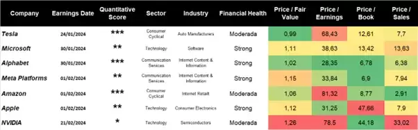 Die quantitativen Bewertungen und Bewertungskennzahlen von Morningstar für die „“glorreichen Sieben“, erstellt anhand von Daten aus der Next Generation Plattform, Stand: 21.01.24