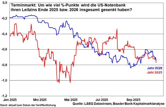 Diese unverklausulierten Aussagen signalisieren den Finanzmärkten eine weitere Zinssenkung auf der Fed-Sitzung am 29. Oktober und zum Jahresende jeweils um 0,25, gefolgt von Senkungen von 0,75 Prozentpunkte 2026. Das nennt man Zinssenkungsfantasie.
