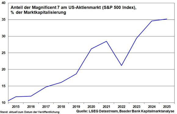 Allein die Magnificent 7 machen mit rund 35% einen überproportional großen Anteil an der Marktkapitalisierung im S&P 500 aus.