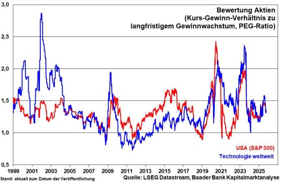 Überhaupt, bezieht man das langfristig erwartete Gewinnwachstum in die Bewertung von Tech-Aktien ein, so sind sie heute deutlich günstiger bewertet als 1999 und weichen ebenso wesentlich weniger stark vom Gesamtmarkt (S&P 500) ab als früher.