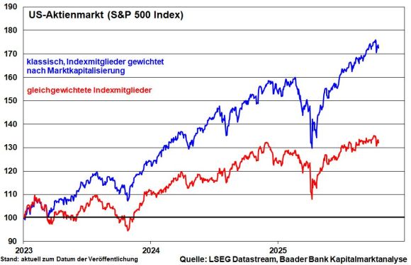 Tatsächlich ist der klassische, nach Marktkapitalisierung gewichtete S&P 500 seinem gleichgewichteten Pendant spürbar entrückt und hat eine entsprechende Fallhöhe erreicht.