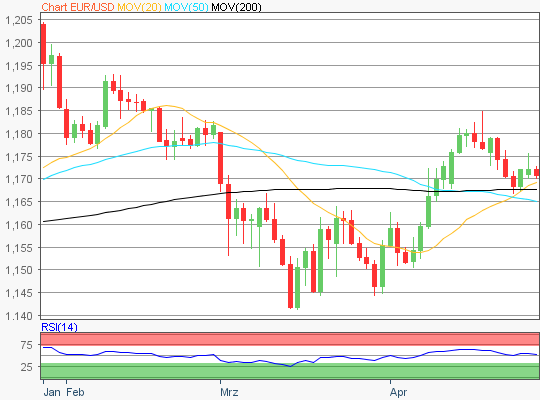- Ausgehend vom Zwischenhoch des 17. April 2026 von 1,1849 bis zum jüngsten Verlaufstief des 23. April 2026 von 1,1668, wären die nächsten Widerstände bei den Marken von 1,1759/1,1780/1,1806 und 1,1849 zu ermitteln.