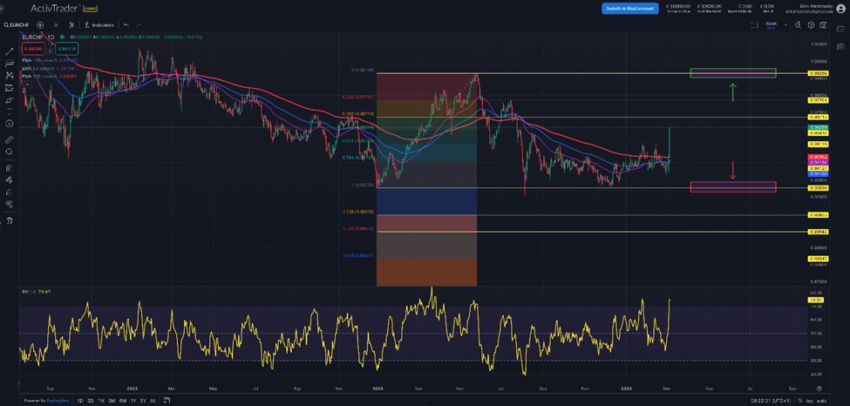 Die vorliegende Chartanalyse erfolgt im Tageschartbild des Währungspaares EUR/CHF. Um die nächsten Ziele der Bullen und Bären näher definieren zu können, wäre an dieser Stelle auf eine Fibonacci-Analyse abzustellen. Die webbasierte Handelsplattform „ActivTrader“ erzeugt die Fibonacci-Retracements, die dann zur Ermittlung der Ziele zur Ober- und Unterseite herangezogen werden können.