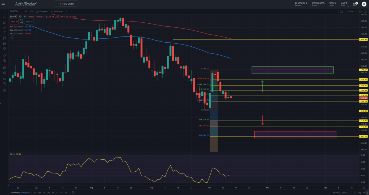 ActivTrades: Die Aufwärtsbewegung vom 03. Oktober bis zum 06. Oktober 2022 war schnell wieder verpufft. Der EuroStoxx50 korrigierte bis dato bis in den Bereich des 0.618- und 0,764prozentigen Fibonacci-Retracements. Neben der Zinserhöhungswelle der Federal Reserve der letzten Monate, die auch in vielen weiteren Ländern zum Ertrinken der Bullen führte, belastet vor allem Europa der Krieg in der Ukraine und die Energiekrise schwer.