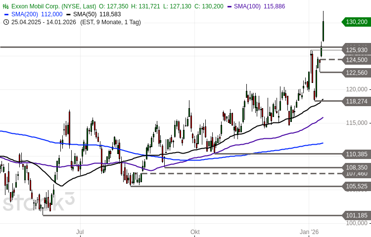 Die Aktie des US-Ölkonzerns Exxon Mobil pendelte seit dem Herbst 2022 nach vorausgegangener Hausse in einer breiten Trading-Range zwischen 95,77 USD und dem im Oktober 2024 erzielten Rekordhoch bei 126,34 USD. Der im April 2025 bei 97,80 USD gestartete mittelfristige Aufwärtstrend erfuhr in den vergangenen Wochen eine deutliche Beschleunigung.