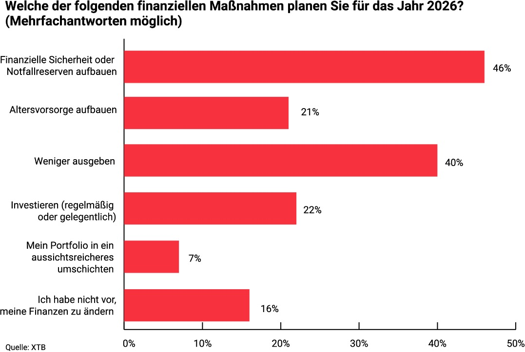 Auf die Frage nach konkreten finanziellen Vorhaben für 2026 nennen 46 Prozent der Befragten den Aufbau finanzieller Rücklagen als wichtigste Maßnahme. 40 Prozent planen, ihre Ausgaben zu reduzieren und gezielt zu sparen.