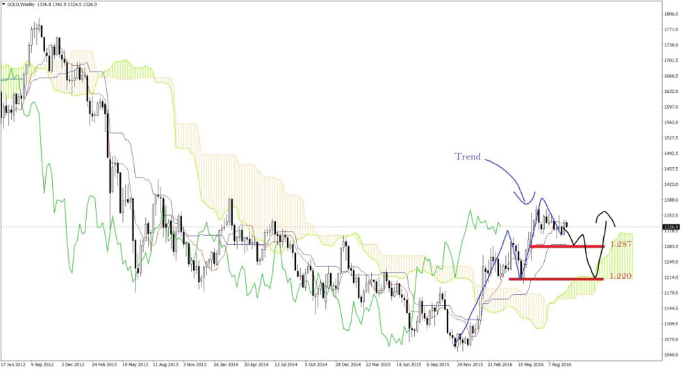 Schauen wir uns den Goldkurs  in der langfristigen Wochenversion mal an. Momentan sollte man vorsichtig agieren. Nach dem der Kurs eine satte Rally hingelegt hatte, ist nun Zeit für eine Verschnaufpause gekommen. Die seitwärts verlaufene Korrektur könnte sich noch etwas hinziehen. Ebenfalls ist eine Konsolidierungsphase mit Rücksetzern bis in den Bereich von 1.287 sehr wahrscheinlich.