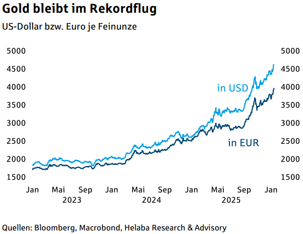Das neue Jahr beginnt so wie es 2025 geendet hat: mit Rekorden! Das Edelmetall legte in den ersten beiden Handelswochen gut 6% in Dollar bzw. 9% in Eurorechnung zu und markierte mit 4.640 US-Dollar bzw. 3.987 Euro je Feinunze neue historische Höchststände. Es dürfte nur eine Frage der Zeit sein, bis die magische Grenze von 5.000 US-Dollar je Feinunze geknackt wird.