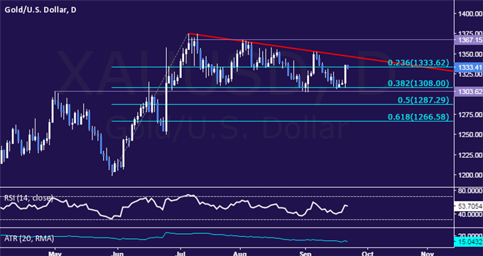 Der Goldpreis beabsichtigt den fallenden Trendlinienwiderstand von Anfang Juli zu testen, nachdem er zurück über das 23,6% Fibonacci-Retracement bei 1333,62 druchgebrochen war. Diese Barriere liegt nun bei 1347,46, wobei ein Durchbruch nach oben einen Double-Top bei 1367,15 freilegen würde. Alternativ ebnet eine Tagesschluss unter 1333,62 den Weg für einen Abrutsch in den 1303,62-08,00 Bereich (Hoch vom 2. Mai, 38,2% Level).