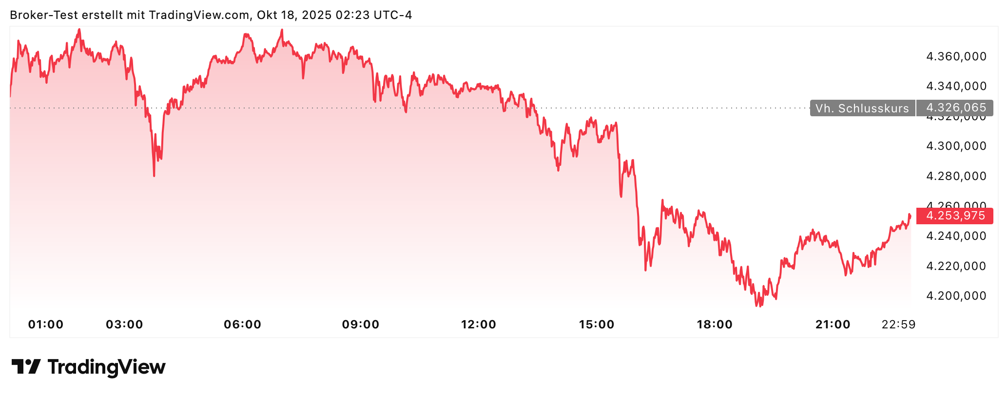 Am Freitag hatte Gold von den diese Woche gesehenen Höchstständen einiges abgeben müssen und handelt derzeit im Bereich rund um die 4254 US-Dollar Marke.