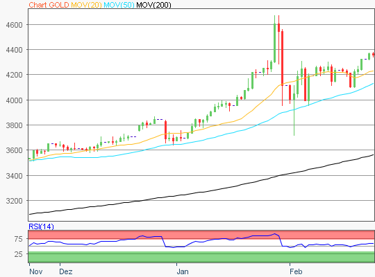 - Es bleibt bei der Analyse vom Rekordhoch des 29. Januar 2026 von 5.598,28 US-Dollar bis zum jüngsten Verlaufstief des 02. Februar 2026 von 4.399,92 US-Dollar, um die nächsten Widerstände bei den Marken von 5.141/5.315 und 5.598 US-Dollar, sowie bei den Projektionen zur Oberseite von 5.881/6.056 und 6.339 US-Dollar ermitteln zu können.
