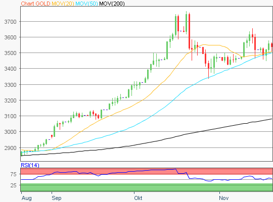 - Ausgehend vom Verlaufstief des 28. Oktober 2025 von 3.879,20 US-Dollar bis zum jüngsten Zwischenhoch des 13. November 2025 von 4.244,93 US-Dollar, wären die nächsten Widerstände bei den Marken von 4.105/4.158 und 4.245 US-Dollar zu ermitteln.