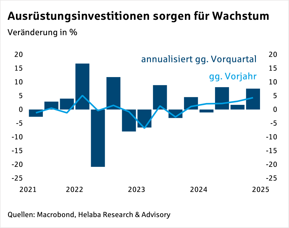 Diese Investitionen tragen nicht nur kurzfristig zum Wachstum bei, sondern stärken auch das langfristige Produktivitätspotenzial der Wirtschaft. Nach mehreren starken Quartalen dürfte sich das Wachstum der Investitionen zwar etwas abschwächen, jedoch voraussichtlich weiterhin positiv bleiben.