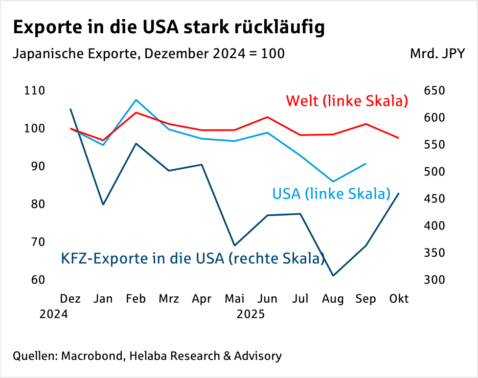 Auch wenn die Zölle für Einfuhren aus Japan mittlerweile auf 15% reduziert wurden, sollte dies weiterhin ein Belastungsfaktor für die japanischen Exporte darstellen. Zwar erholten sich die Kfz-Exporte nach dem starken Einbruch etwas, dennoch ist dies kein Einmalschock, der schnell aufgeholt wird. Entlang der Wertschöpfungskette sind auch nachgelagerte Effekte bei Zulieferern zu erwarten, wodurch die gesamte Industrie beeinträchtigt wird.
