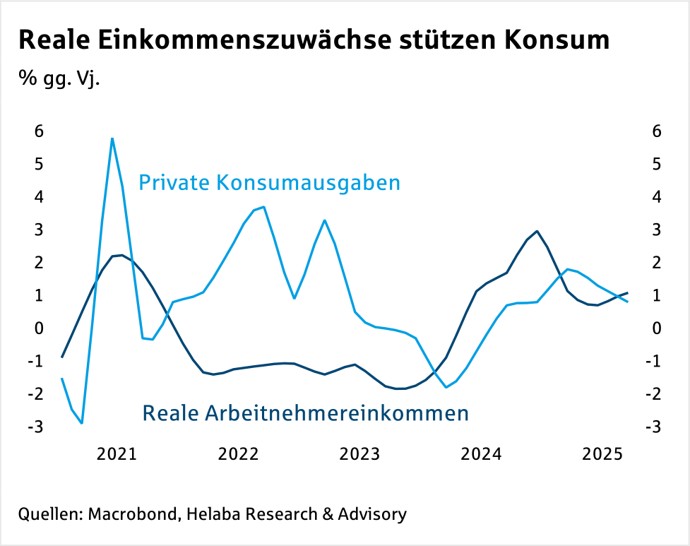 Auch die Verbraucher tragen zum Wachstum bei. Der private Konsum wuchs sechs Quartale in Folge dank steigender Realeinkommen. Die realen Arbeitnehmereinkommen stiegen zuletzt auf Jahressicht um ca. 1% und es spricht wenig gegen ein weiteres Wachstum. Für 2026 erwarten wir daher, dass der private Konsum weiterhin moderat zulegen kann.