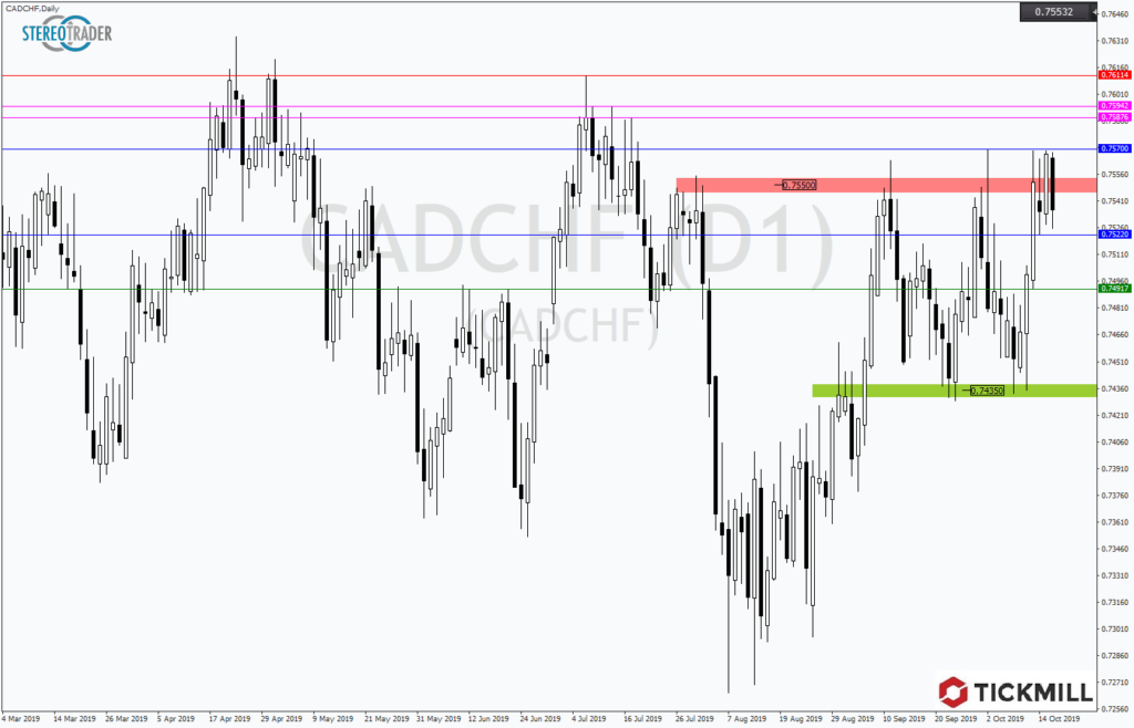 Seit der Rückkehr der FX-Paarung CADCHF in den Widerstandsbereich um 0,75500 CHF kommen die Kurse kaum vom Fleck. In den vergangenen drei Handelstagen hat sich eine Tradingrange zwischen 0,75700 CHF und 0,75220 CHF ausgebildet.