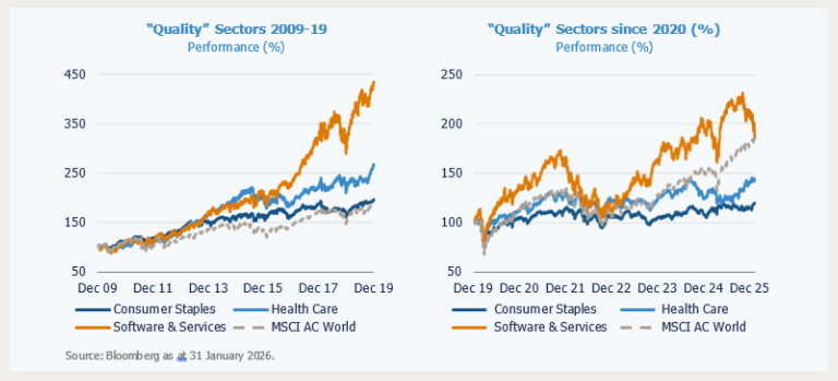 Nach der globalen Finanzkrise waren Investoren mehr als ein Jahrzehnt lang damit zufrieden, „Qualität“ zu fast jedem Preis zu halten. Kapital floss kontinuierlich in die Bereiche Basiskonsumgüter, Gesundheitswesen und Software, von denen man annahm, dass sie Widerstandsfähigkeit, Preissetzungsmacht und dauerhaftes Wachstum bieten. In den letzten drei bis fünf Jahren wurde diese Annahme jedoch zunehmend in Frage gestellt.