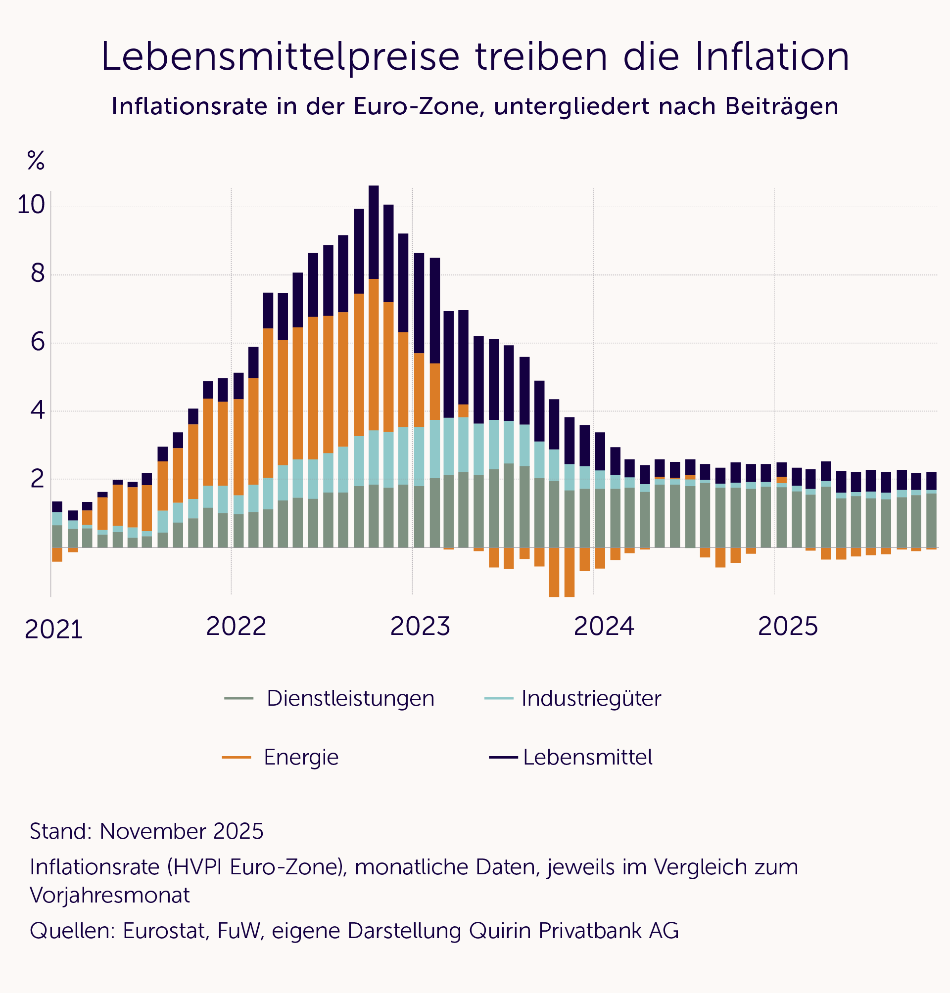 Beim näheren Blick auf die jüngsten Teuerungsdaten fällt auf, dass die Lebensmittelpreise immer noch vergleichsweise hohe Steigerungsraten aufweisen (siehe nachfolgende Grafik).
