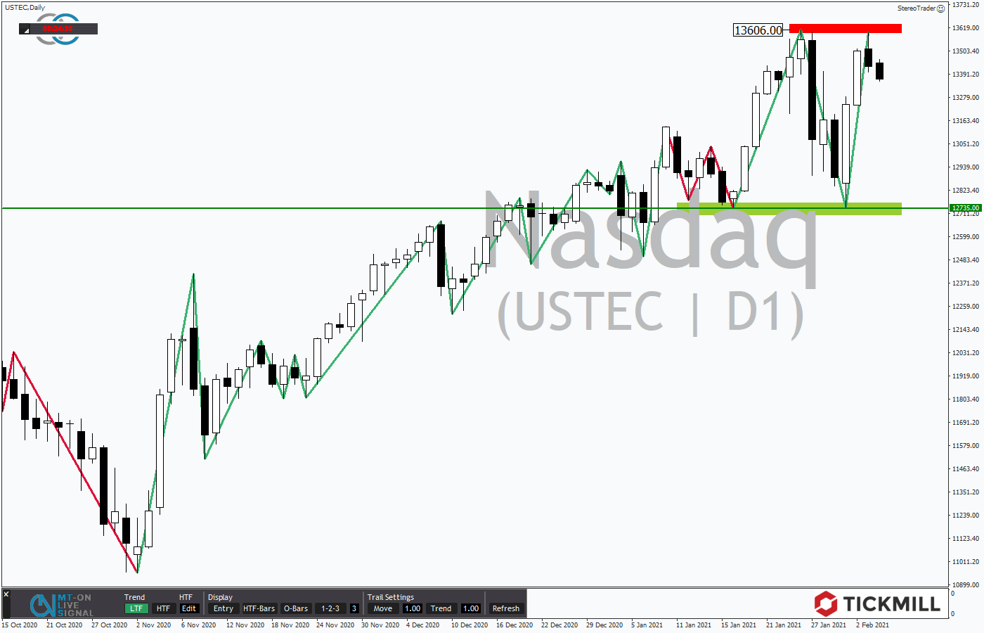 Mit Blick auf die jüngste Verortung am Allzeithoch bei 13.606 Punkten wird es nun interessant, wie die Händler hier reagieren. Wird der Ausbruch nach oben gekauft, steht mittelfristig als nächstes die Runde Marke von 14.000 Punkten zum Test auf der Agenda.