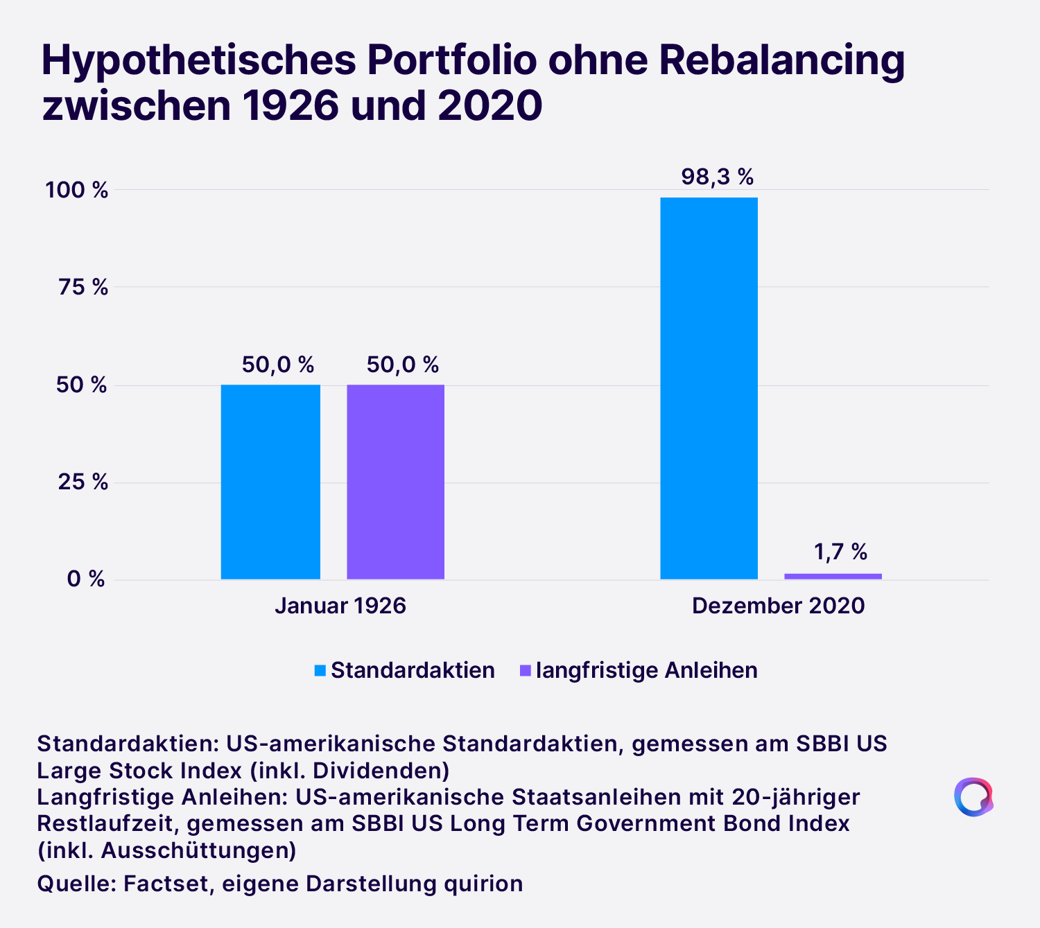 Das Risiko des hypothetischen Portfolios ist also extrem gewachsen. Denn schließlich schwanken Aktienkurse viel stärker als die von Anleihen. Mit einem Rebalancing werden die Auswirkungen von Wertschwankungen auf das Portfolio ausgeglichen.