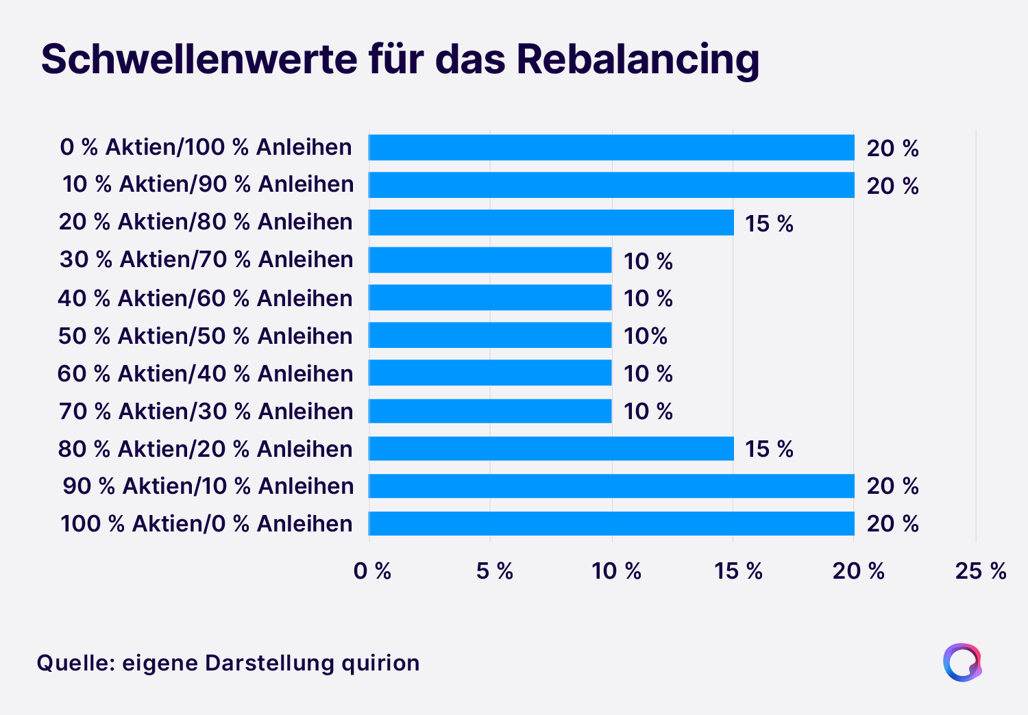 Die Schwellenwerte richten sich nach dem persönlichen Anteil der jeweiligen Anlageklassen im Portfolio. Ist der Anteil einer Anlageklasse besonders hoch, liegt der Schwellenwert höher. „Ansonsten würde das Rebalancing zu oft angestoßen.“