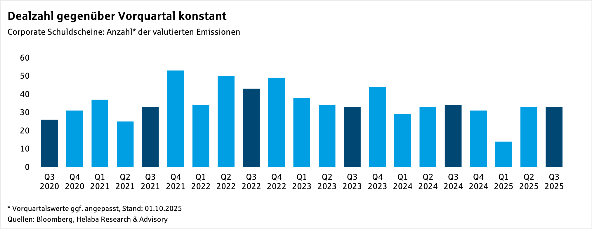 In Q3 konnte der Schuldscheinmarkt die dynamische Entwicklung des zweiten Quartals fortsetzen. Stand heute wurden in 33 Transaktionen knapp 7 Mrd. EUR valutiert – rund 800 Mio. EUR mehr als in den Monaten April bis Juni. Allerdings fiel in diesen Zeitraum auch der Schuldschein der Porsche Automobil Holding in Höhe von 1,5 Mrd. EUR, dessen Vermarktungsphase bereits im zweiten Quartal abgeschlossen war. Zu den übrigen größeren Platzierungen des dritten Quartals gehören der Schuldschein der österreichischen ÖBB-Personenverkehr AG (650 Mio. EUR) sowie der italienischen Fincantieri SpA (395 Mio. EUR). Gegenwärtig befinden sich nach unserem Kenntnisstand 11 Transaktionen mit einem Startvolumen von 1,1 Mrd. EUR in der Vermarktungsphase.