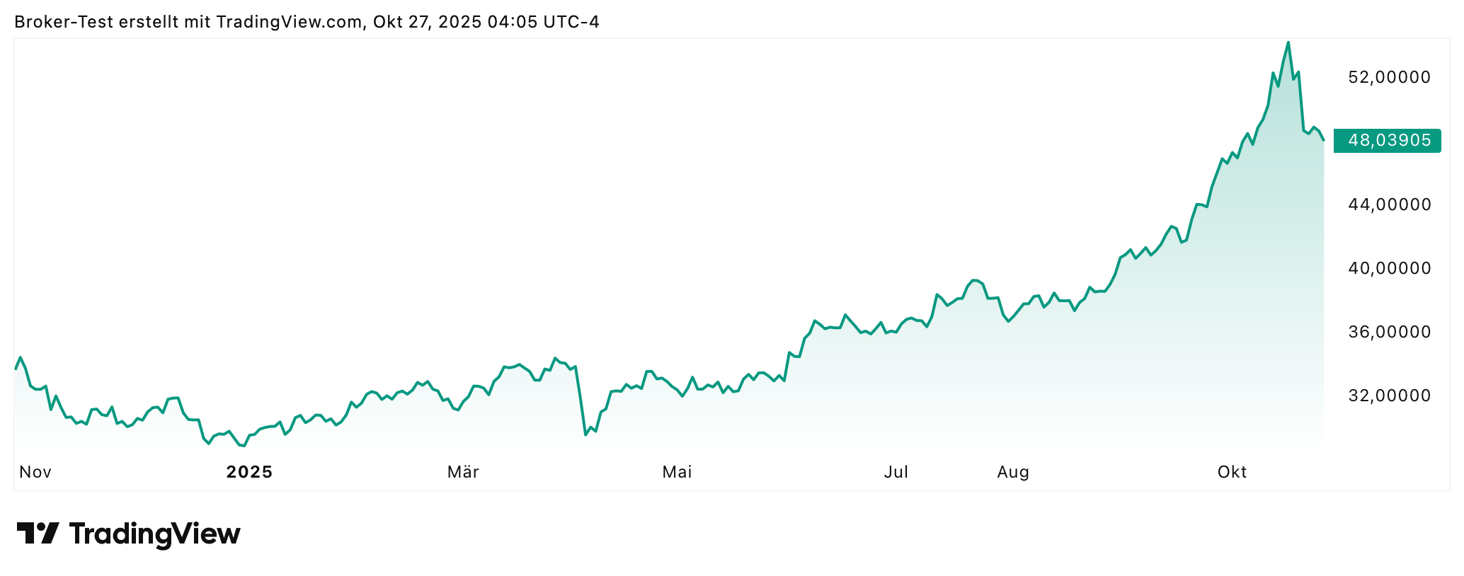 - Ausgehend vom übergeordneten Verlaufstief vom 07. April 2025 von 28,11 US-Dollar bis zum Rekordhoch des 17. Oktober 2025 von 54,48 US-Dollar, wären die nächsten Widerstände bei der Marke von 54,48 US-Dollar, sowie bei den Projektionsstufen von 60,70/64,55 und 70,77 US-Dollar abzuleiten.