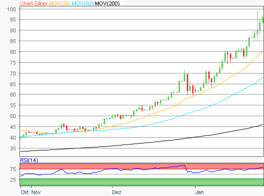 Silber notiert mittlerweile deutlich über der magischen 100 USD Marke.