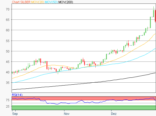 Der Silberpreis kannte lange Zeit nur eine Richtung und das war steil nach oben - doch nach dem zuletzt spektakulären Anstieg über 80 US-Dollar ging es dann heute erstmal ein bisschen runter. Einige Anleger haben wohl erstmal ein paar Gewinnmitnahmen Richtung Jahresende gesichert. Das heißt aber nicht unbedingt, dass der Siegeszug von Silber jetzt gestoppt ist. Es kann durchaus sein, dass es in den nächsten Tagen oder im neuen Jahr mit dem Silberpreis weiter Richtung Norden geht.