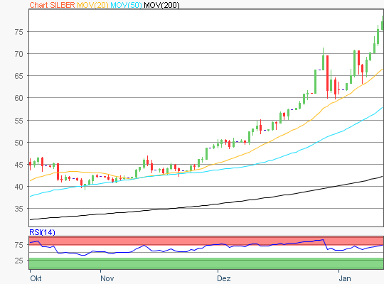 Silber macht 2026 einfach dort weiter, wo es 2025 aufgehört hat. Es steigt und steigt und steigt. Kein Wunder bei den aktuellen Rahmenbedingungen.