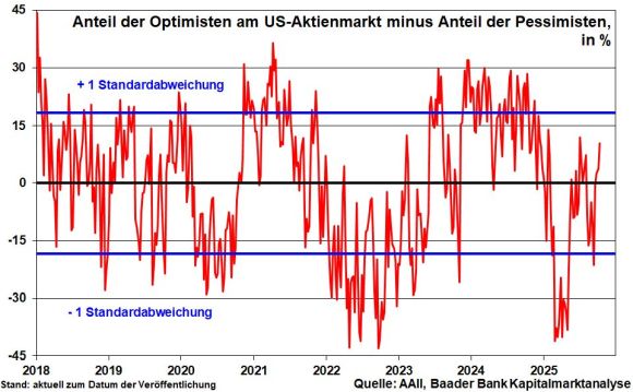 Trotz der hohen Aktienstände zeigt sich der Anteil der Optimisten abzüglich der Pessimisten am US-Aktienmarkt unverdächtig.