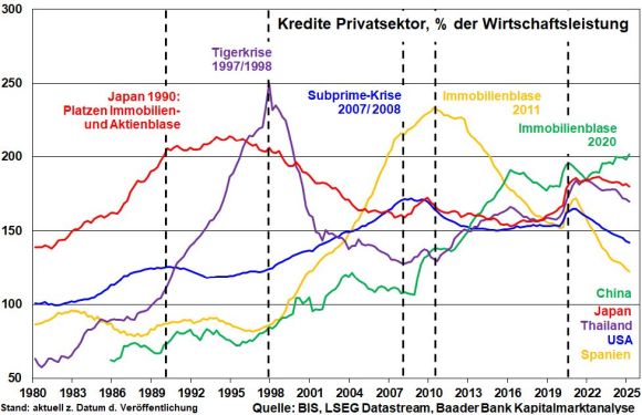 Historisch zeigt sich, dass früheren Blasen – z.B. Japans Aktien- und Immobilienblase oder die Subprime-Krise – regelmäßig eine Überschuldung des Privatsektor vorausging. Anschließend führten in der Regel Zinsverteuerungen der Notenbanken zum Platzen der Blasen. Heute ist in den USA die Privatverschuldung gemessen am BIP sogar rückläufig, während die Fed gerade einen neuen Lockerungszyklus eingeleitet hat. Überhaupt bezahlen die US-Tech-Riesen ihre Milliardeninvestitionen aus ihren wohl gefüllten Gewinntöpfen. Mit den Potemkinschen Dörfern der Internet-Blase haben sie wenig bis nichts zu tun.