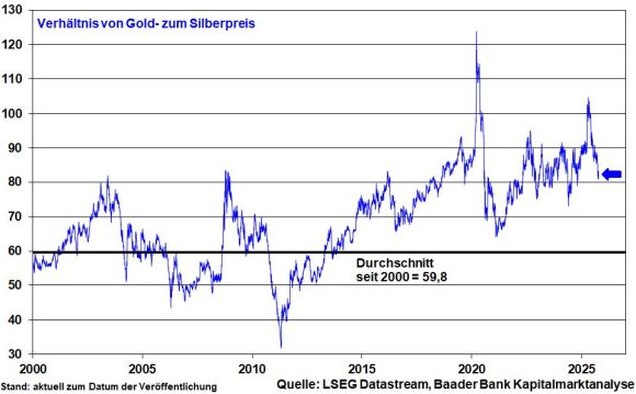 Zwar hat sich das Preisverhältnis von Gold zu Silber von seinem Hoch im April 2025 von 104 auf aktuell 82 bereits spürbar verringert, so dass zumindest ein Teil der Unterbewertung von Silber aufgeholt wurde.