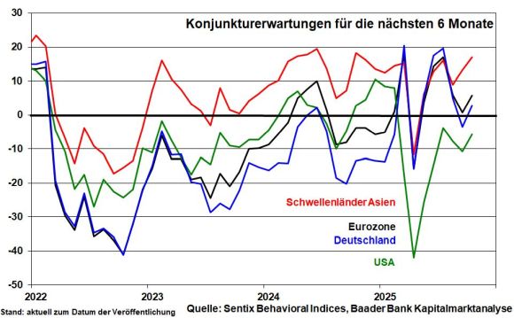 Aktienpositiv wirkt zudem die Aufhellung des weltkonjunkturellen Umfelds. Gemäß der vom Analyse-Institut Sentix ermittelten Konjunkturerwartungen für die nächsten sechs Monate ist eine Stabilisierung vor allem in Asien abzulesen, von der ebenso die exportzyklischen Aktien in Europa profitieren.