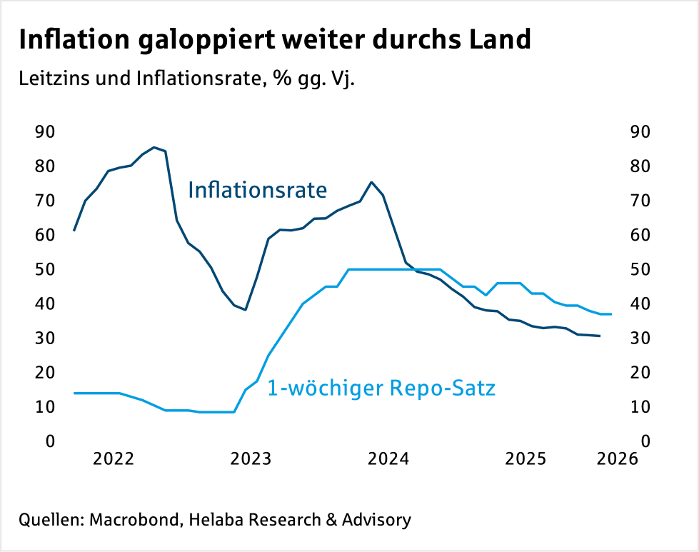Die Zentralbank peilt für 2026 eine Inflationsrate von 16 % und für 2027 von 9 % an, bevor ab 2028 das mittelfristige Ziel von 5 % erreicht werden soll.